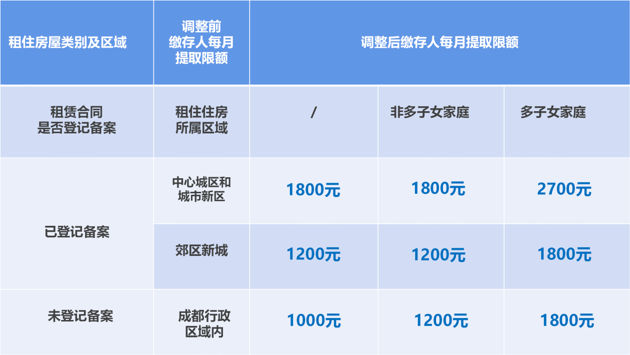 如何理解多子女家庭租房提取限额上浮50%?成都住房公积金管理中心解释称,为落实国家卫健委等17部门《进一步完善和落实积极生育支持措施》(国卫人口发〔2022〕26号)文件精神,对多子女家庭精准实施租房提取支持政策。符合租房提取条件的多子女家庭,租赁合同已登记备案且租住住房位于中心城区和城市新区的,缴存人每月提取限额为2700元,每年累计提取金额不超过3.24万元;租赁合同已登记备案且租住住房位于郊区新城的,缴存人每月提取限额为1800元,每年累计提取金额不超过2.16万元;租赁合同未登记备案的,缴存人每月提取限额为1800元,每年累计提取金额不超过2.16万元。