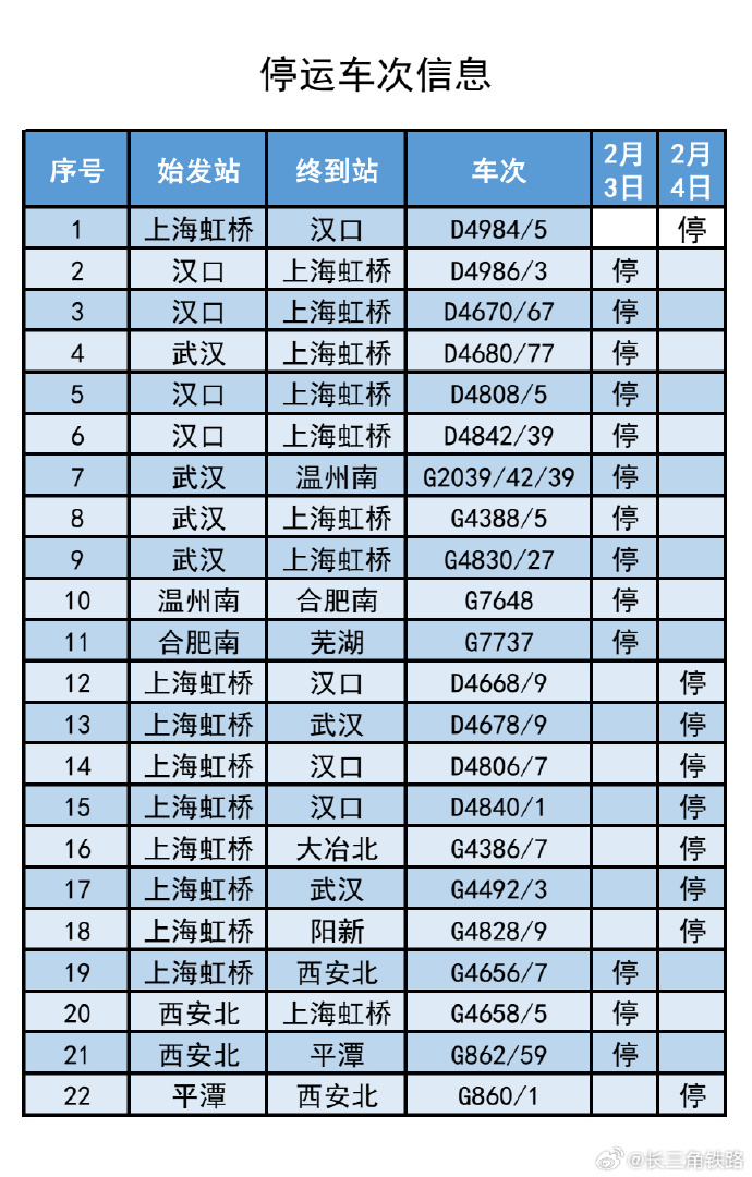 【最新:受低温雨雪冰冻天气影响 部分列车停运 退票可免手续费】受北方地区大范围低温雨雪冰冻天气影响,为确保旅客列车运行安全和旅客出行安全,铁路部门计划对受影响线路运行的部分列车采取停运措施。截至2月3日15时,计划停运2月3日至2月4日间22趟旅客列车。(停运列车车次信息见附表)